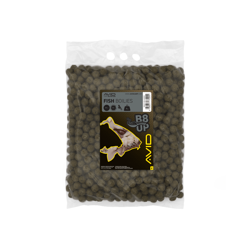 Boilies van het merk Avid Carp, assortiment B8 tot en met, smaak Vis, speciaal voor karpervissen.