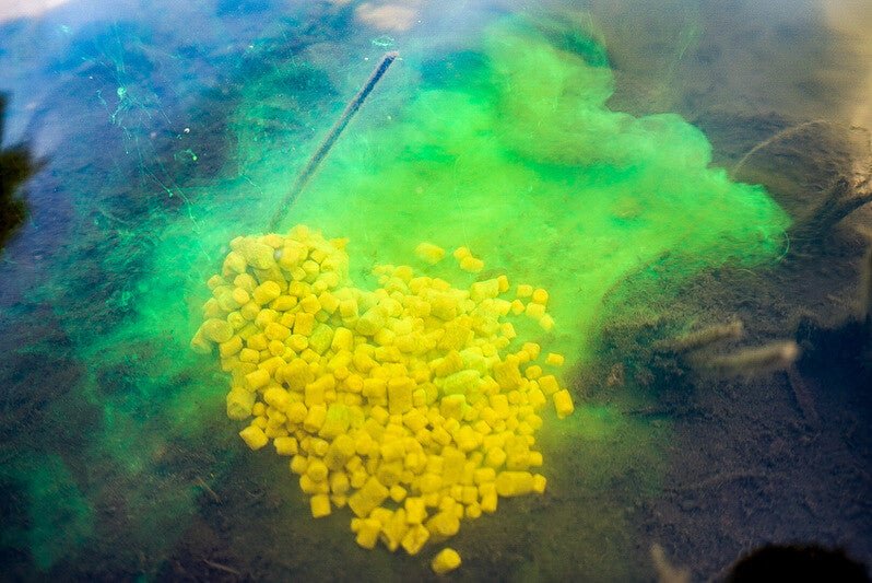Flesje vloeistof fluorescerend merk explosief Pro Elite Baits smaak Krill Krab op Kleur groen van 150 milliliter, speciaal voor het karpervissen.