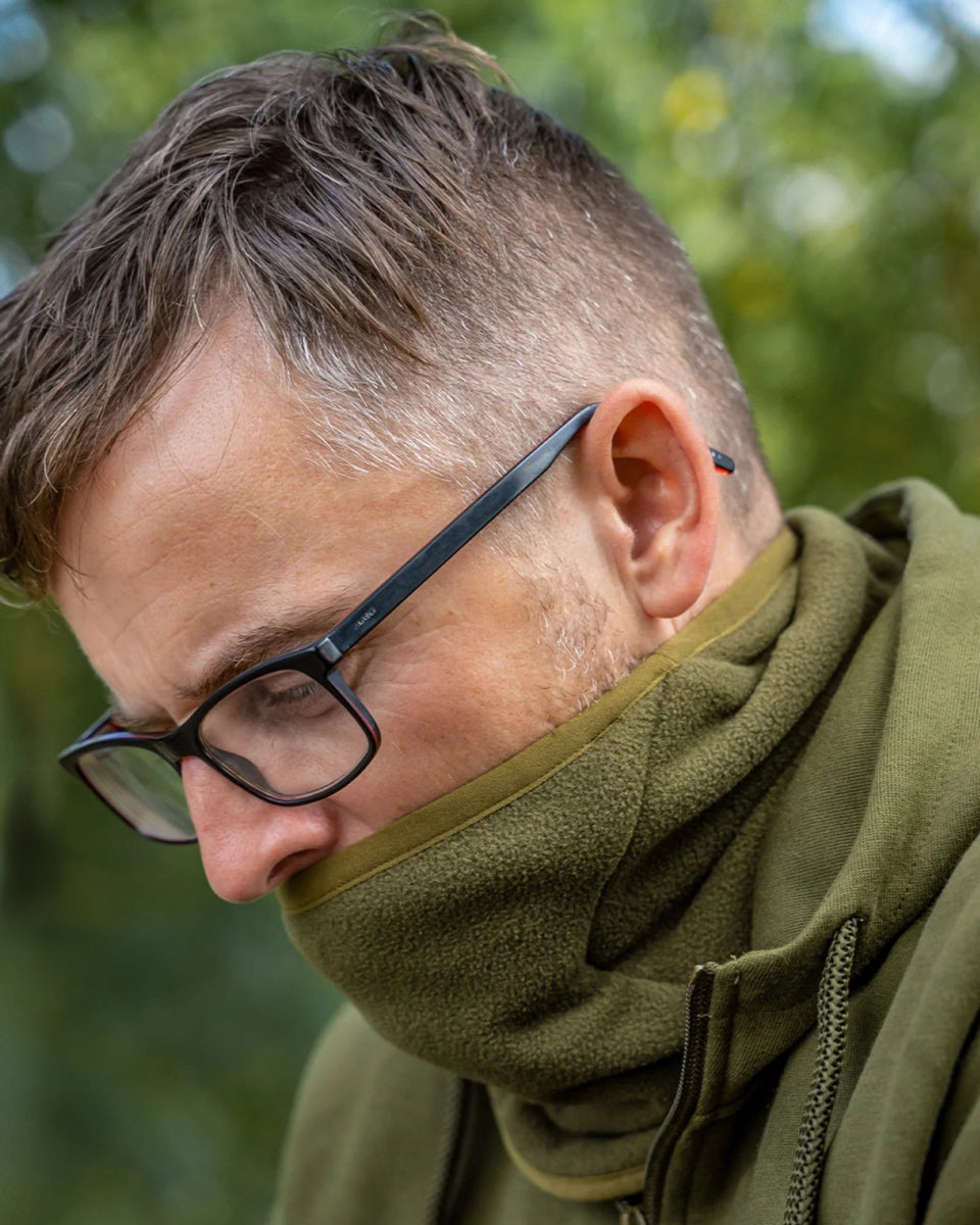 Merk nekwarmer slip Korda model LE op Kleur groen en in in één maat, speciaal voor het karpervissen.