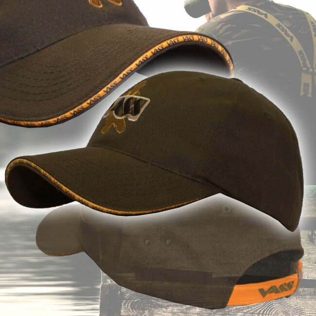 Gemerkte pet Vass model VH419 op Kleur kaki met logo, speciaal voor het karpervissen.