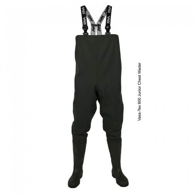 PVC steltlopers voor kinderen van het merk Vass model Tex 600-70J borst Junior op Kleur groen, vooral voor het karpervissen.