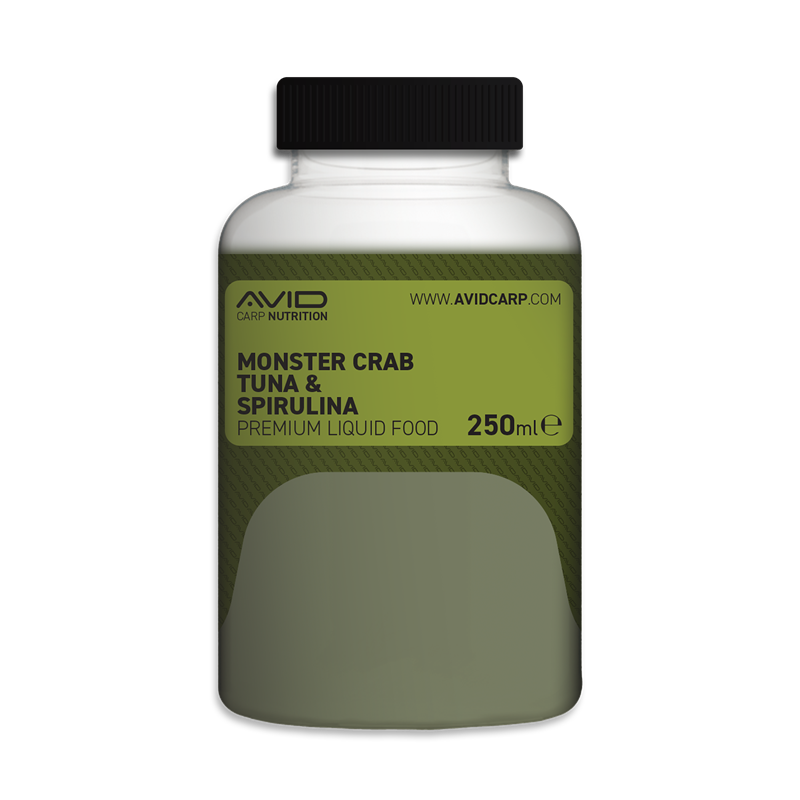 Vloeibaar additief van het merk Avid Carp, gamma Premium, smaak Monster Crab-Tonijn & Spirulina, speciaal voor je karpervisaas.