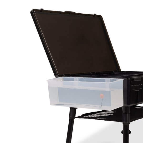 Tacklebox stijf met gemerkte tafel Nashmodel, model TT Rig Stationin Kleur grijs, speciaal voor het karpervissen. Diepe tacklebox voor het opbergen van alles wat je nodig hebt.