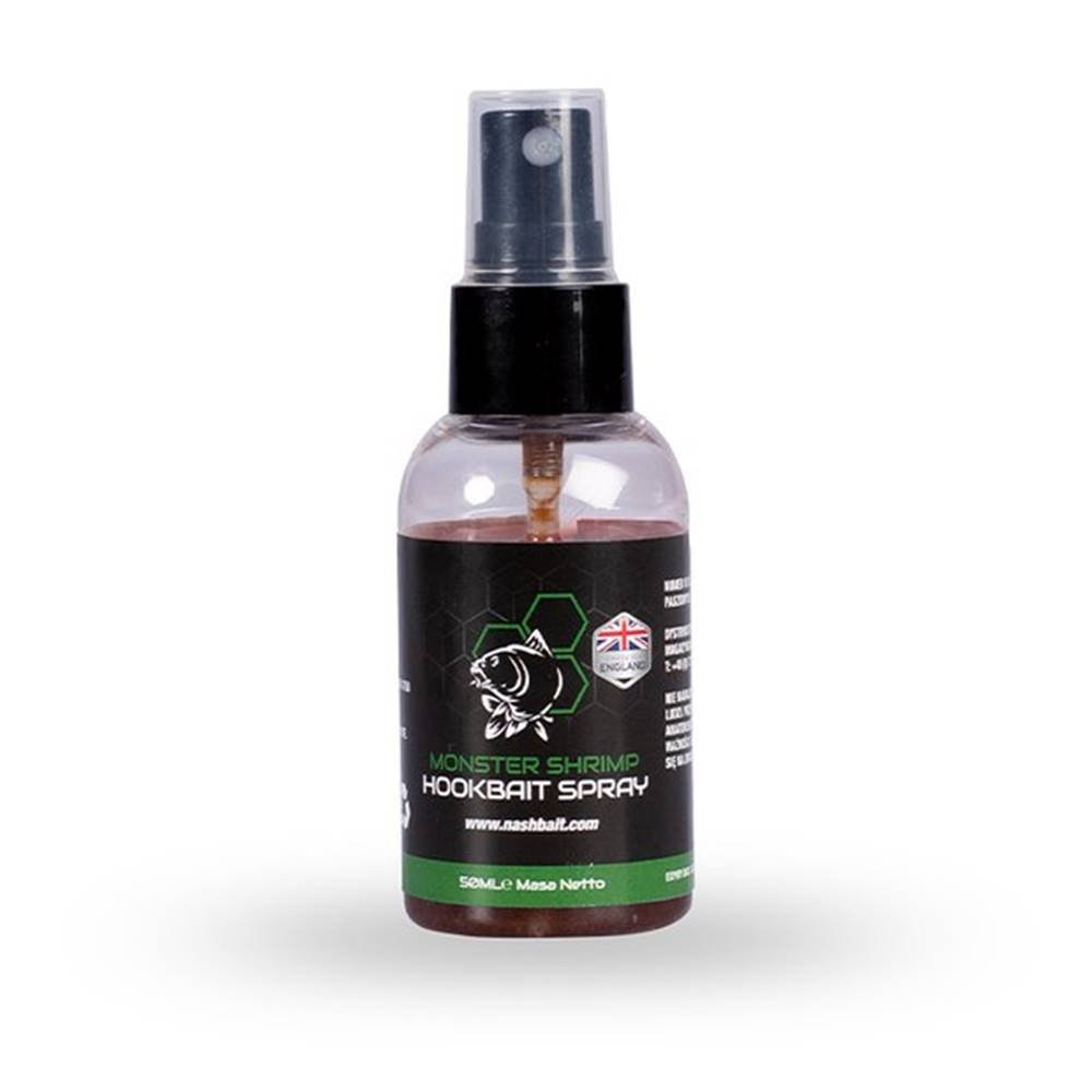 Lokmiddel Spray Aas, van het merk Nash, geparfumeerd met Monster Shrimp, speciaal voor karpervissen.