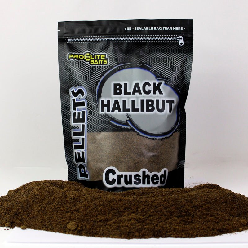 Pellets versnipperd van het merk Pro Elite Baits smaak Heilbot op Kleur zwart, speciaal voor karpervissen.