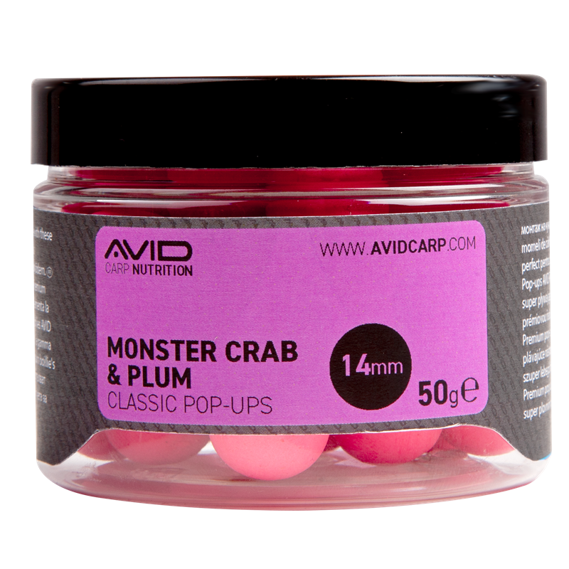 Pop Ups Merkdrijvers Avid Carp, assortiment Classic, smaak Monster Crab & Pruim, speciaal voor karpervissen.
