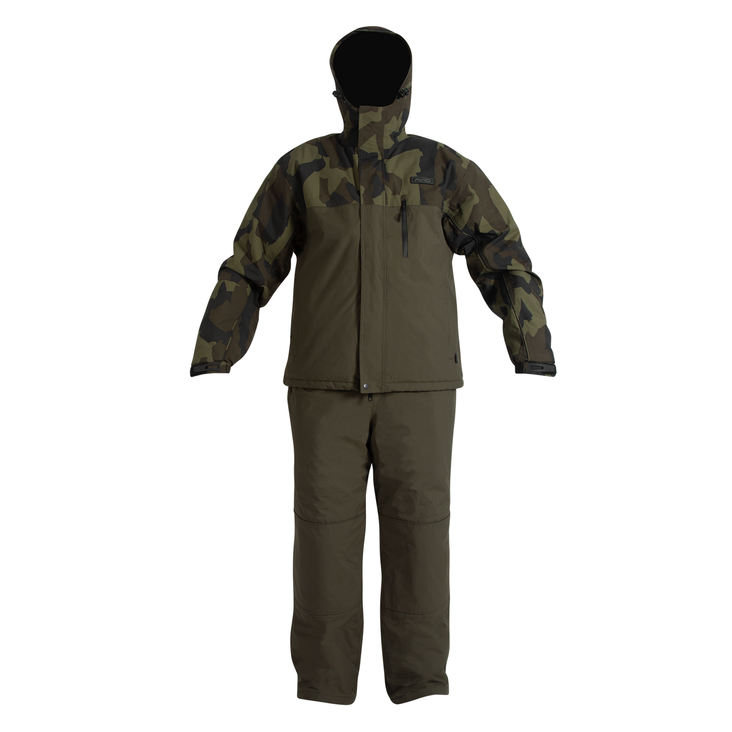 Thermisch pak Regenjas merk Avid Carp model Arctic-serie 2-delig met ontwerp in Kleur militair groenideaal voor je carpfishing-sessies.