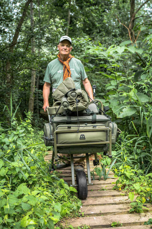 Gemerkte transportwagen Korum model Overgang Compactspeciaal voor karpervissen.