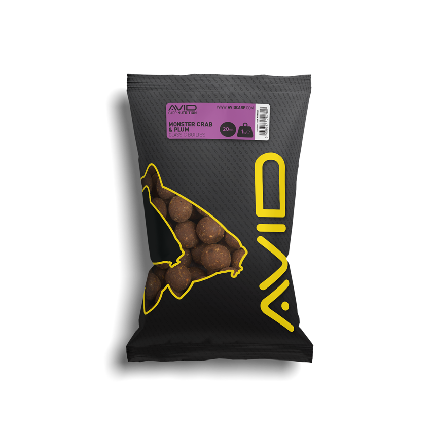 Boilies van het merk Avid Carp, assortiment Classic, smaak Monster Crab & Pruim, speciaal voor karpervissen.