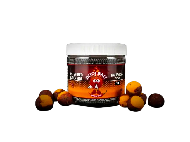 Helft van het merk Dudi Bait van 14 millimeter op smaak gebracht met Mister Super Hot op smaak gebracht met kruidige vis, speciaal voor karpervissen.