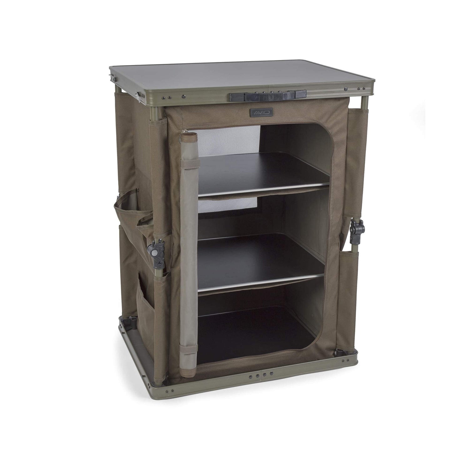 Tafel met opbergkast van het merk Avid Carp, model Snel omhoog Session, op Kleur camo, speciaal voor je carpfishing-sessies.